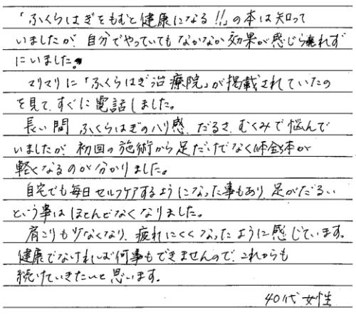 ふくらはぎの状態は1人1人、全く違います。早く症状を改善させたいと気持ちだけが先走る中、なかなかコツを掴むことが出来ず、悪戦苦闘の毎日でした。