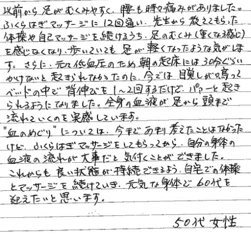 私も長年営んでいた畳屋の腰痛、ひざ痛がひどく悩みのタネでしたが、うす紙をはがすように改善されました。その他にも夫婦2人で健康になり病院、服薬なども全くなく60代でこんなに元気になれて本当に感謝の気持ちでいっぱいです。