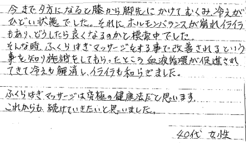 長年悩んでいた高血圧、冷え性、ひざ痛、腰痛、不眠、肌荒れ、肩こりなどなどがふくらはぎを揉んでいくうちに解消していく体験談を読み、さっそくその日から夫婦で揉み合いをするようになりました。