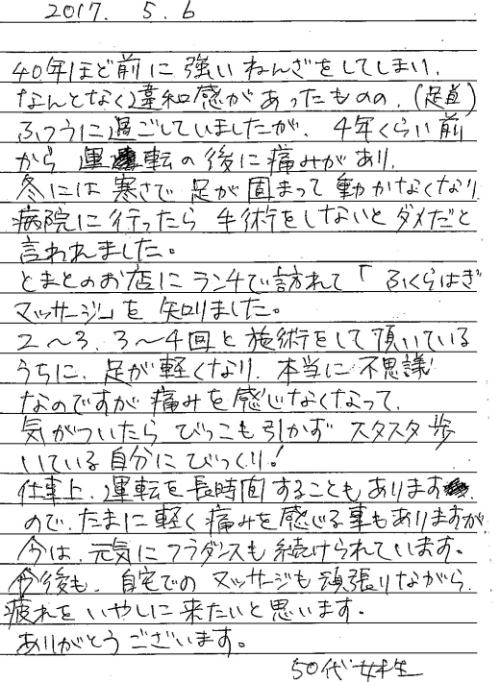 大ベストセラーとなった「長生きしたけりゃふくらはぎをもみなさい」の著者槇孝子氏から直接東京で指導を受けて、ふくらはぎ療法師の認定を取得。