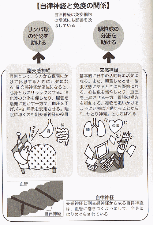 ところで、この自律神経が免疫システムに深いかかわりがあることが明らかになってきました。安保免疫システム論のなかでも重要なキーワードとなる「顆粒球」と「リンパ球」という免疫細胞がありますが、この二つは自律神経と密接な関係にあるのです。交感神経優位のときには顆粒球の働きが活性化し、副交感神経優位のときはリンパ球が活性化します。「顆粒球=交感神経」「リンパ球=副交感神経」という図式がわかれば、複雑な免疫システムもマスターできるのです。